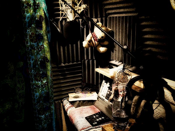 So, let’s take another walk over this direction. And over here (just tripping over something) and we come into what is the voice booth, and I am just going to put my headphones on. Right, umm, and this is where I normally do the recording. You get the idea!