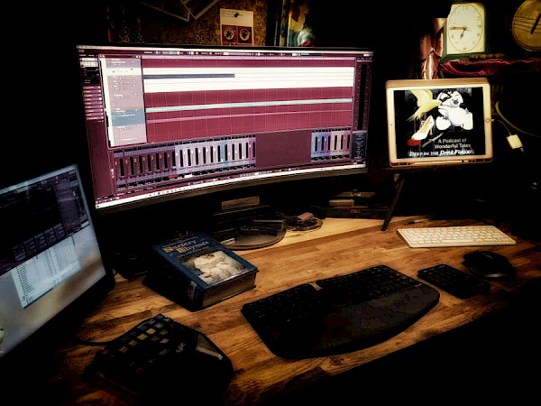 Right, first of all, I am sitting in front of my huge monitor, and then I have a little monitor on my left, I pad up to the right, and a few other bits and pieces, my controllers and things. This is where I do the editing and bits of composing, and that sort of thing.
