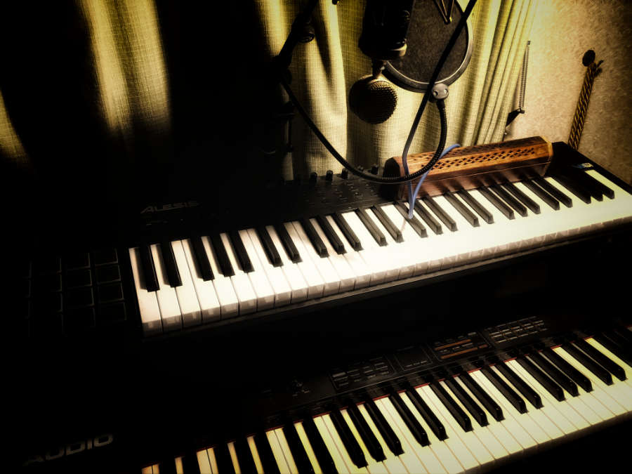 Now, if I go to my left, and wander over here, go off mic and onto another one, here we have a microphone over my keyboards. So, piano and that sort of thing. Which is all very well and neat, yeah?