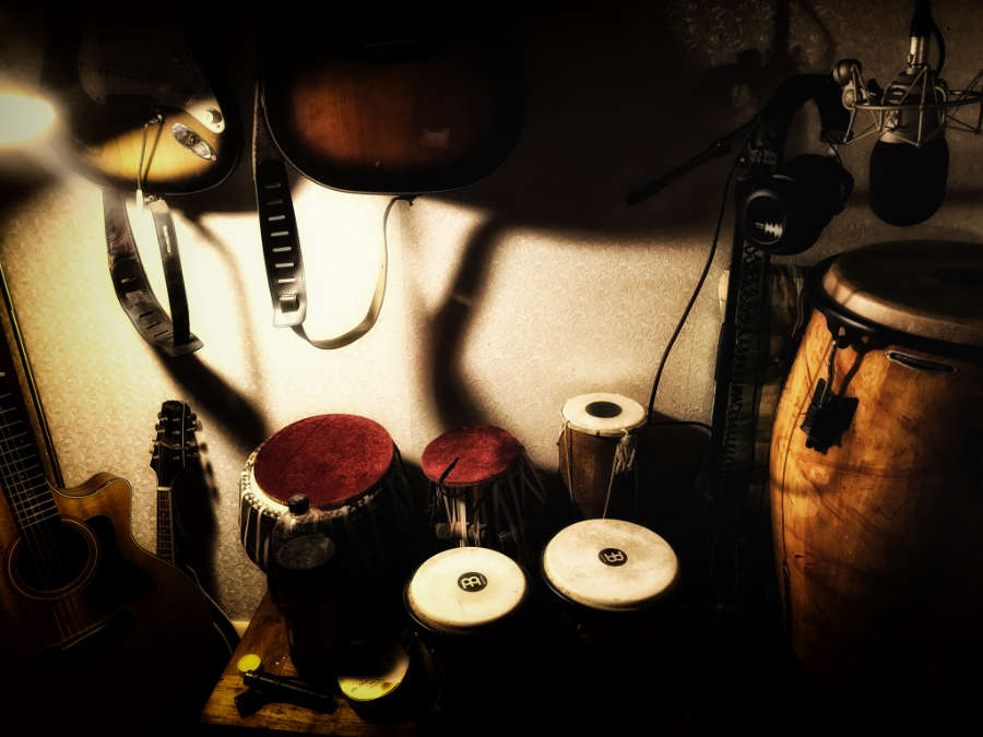 Right, now let’s take another walk, and walk into another part of the room. And over here this is where I keep my percussion and some of my guitars. And things – got a couple of bongos, tablas, that sort of thing and a guitar on the wall. So that’s alright.